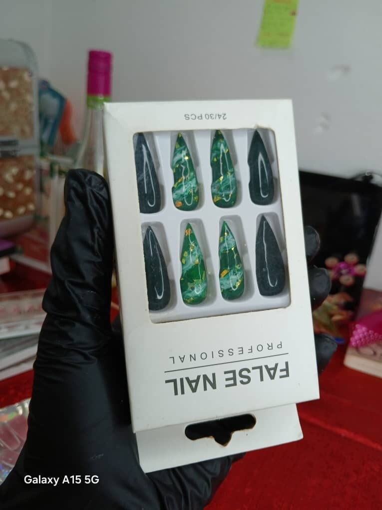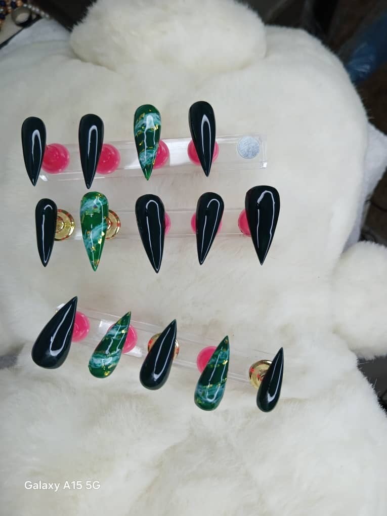 Long stiletto, green color, marble design on 1 finger. Polygel builded Press On Nails. Ready to wear, very solid and reusable. Comes with glue and file for an easy and durable installation anytime, anywhere. Get a salon quality without moving from your home.